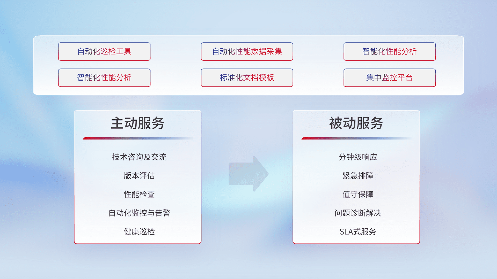 智能化工具和标准化文档,,,保障服务质量,,,提供主动服务(包含技术咨询、、、版本评估、、性能检查、、、自动化监控与告警、、、、健康巡检)和被动服务包含(分钟级响应、、、、紧急排障、、、值守保障、、问题诊断解决、、、SLA服务)。。。。