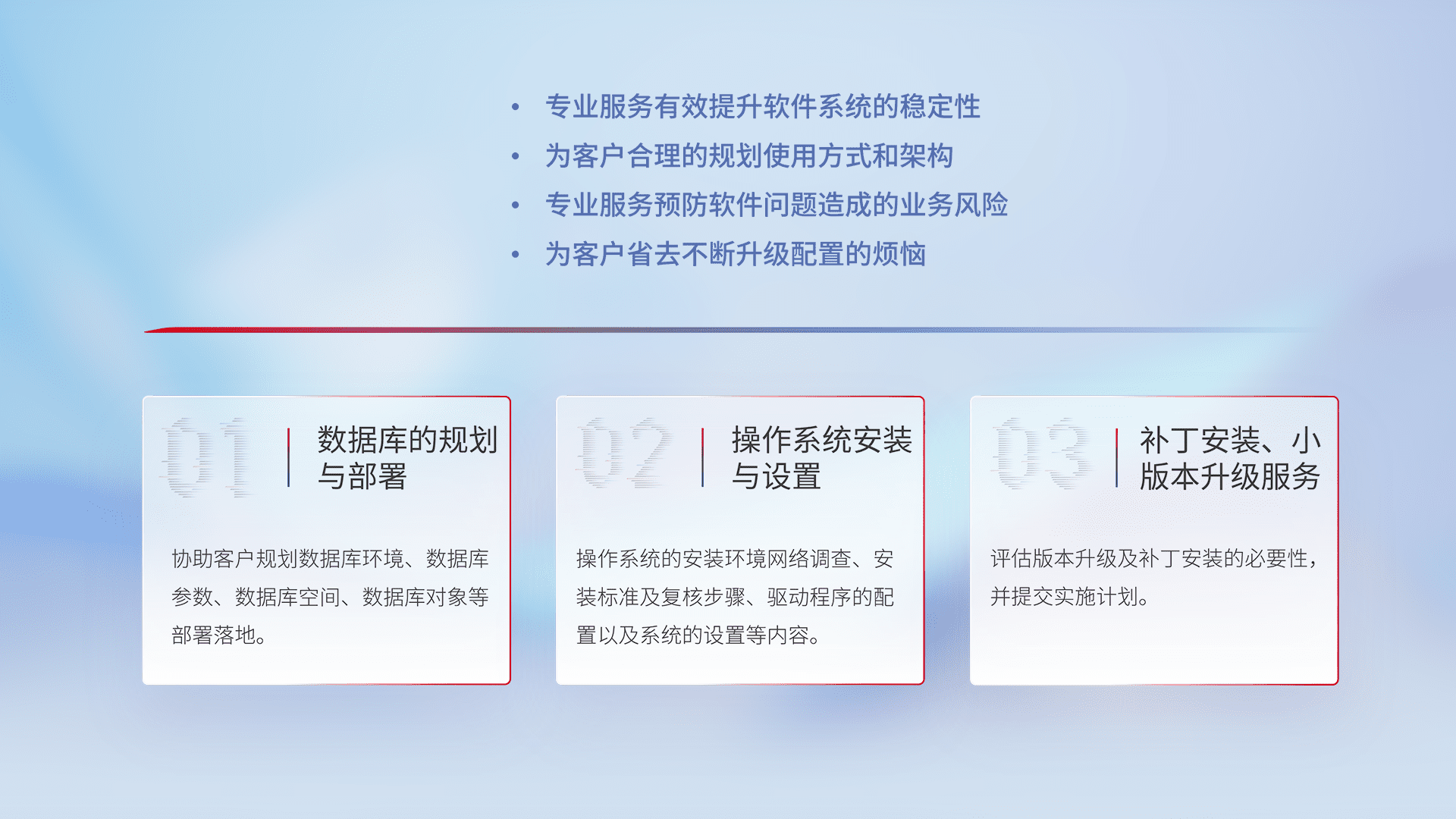 为客户提供软件规模升级、、快速部署、、按需配置的专业服务,,,从数据库的规划与部署到操作系统的安装与设置,,,,再到补丁安装和小版本升级提供支持。。。